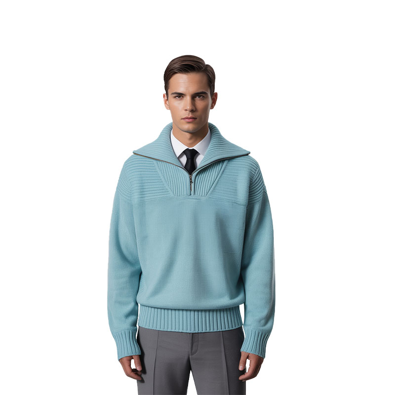 This Sky Blue Half-Zip Funnel Neck Knit Sweater features a fresh light sky blue hue, as clean and soft as a clear spring day. The large funnel neck paired with a half-zip closure allows you to wear it upright for wind protection or fold it down for a polished look, blending practicality with style. Crafted with fine knitting techniques, ribbed textures at the collar and shoulders add visual depth, while the relaxed drop-shoulder silhouette balances comfort and presence. Ribbed cuffs and hem effectively prevent deformation. Whether layered over a white shirt and tie for a business-casual vibe or worn alone for a laid-back statement, it effortlessly adapts to various occasions.