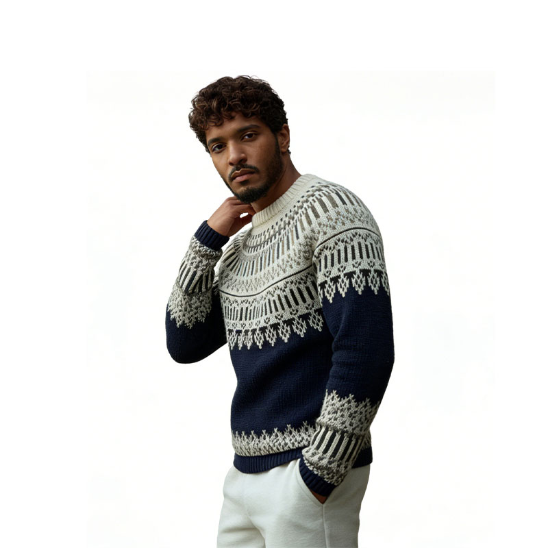 This Nordic Snow Fair Isle Knit Sweater centers on classic Fair Isle intarsia craftsmanship, with off-white and navy blue interwoven into rich geometric patterns, like Nordic motifs on snow, blending retro warm texture with winter atmosphere. The crew neck fits closely to the neck, and the relaxed silhouette balances comfort and casualness. The intarsia textures on the body and cuffs progress layer by layer, from the radial pattern on the shoulders to the snowflake pattern at the hem, and every detail highlights the handcrafted delicacy. Whether paired with casual pants for a daily lazy style or layered with a coat to cope with cooling weather, it can easily convey a calm and stylish attitude towards dressing.